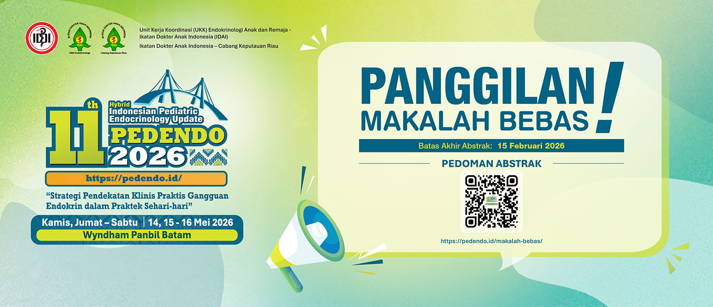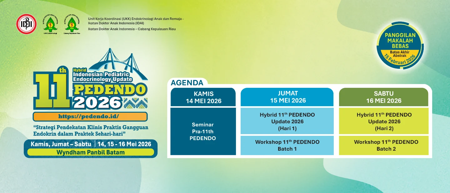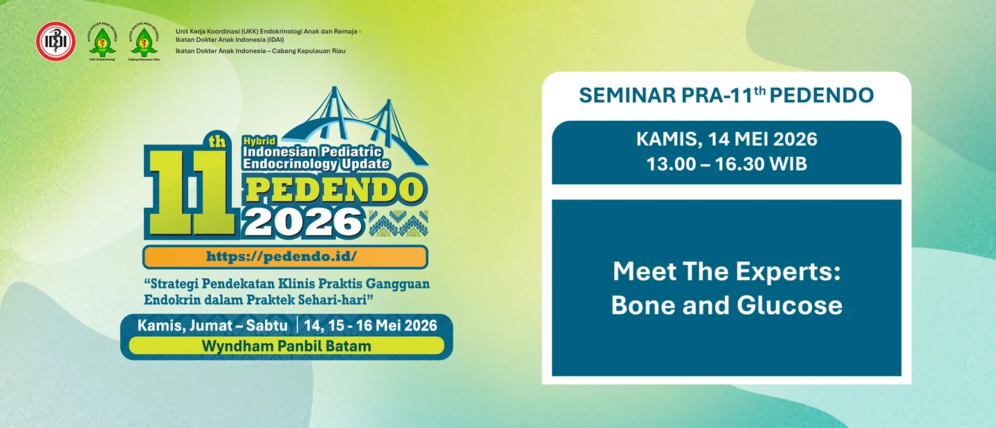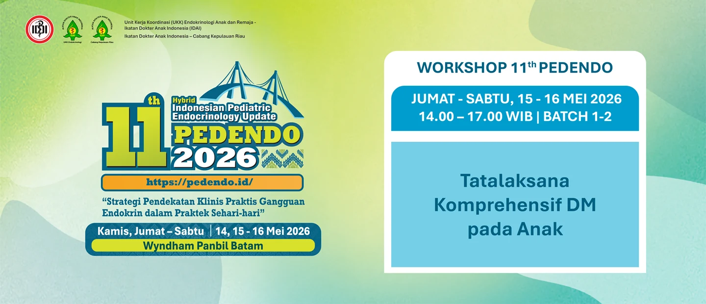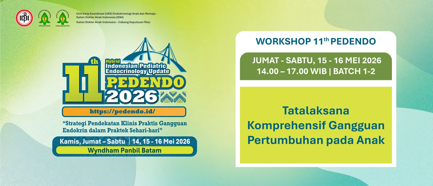 Dengan penuh rasa syukur dan kebanggaan, saya menyambut Bapak/Ibu sejawat dalam perhelatan 11th Indonesian Pediatric Endocrinology Update (PEDENDO 2026) yang akan berlangsung pada 14–16 Mei 2026 di Wyndham Panbil Batam.